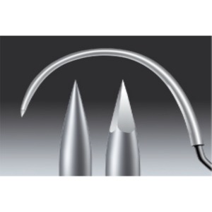 ●針材はSUS304の硬質タイプを使用し、針先端は滑らかなテーパー角度加工によりスムーズな組織通過、又糸材との加締め孔加工はレーザードリルにより強固で組織損傷が少ないです。
