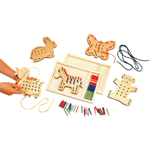 5種類の形をした板面に空いた穴を使用してひも通し、ペグの両方の訓練ができます。
