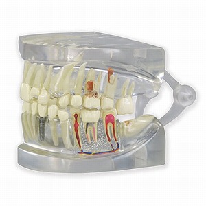 実物大の可動型顎モデルです。顎が透明なので歯根部が観察できます。半側は健康な歯を描いており、正常な歯列と咬合が確認できます。